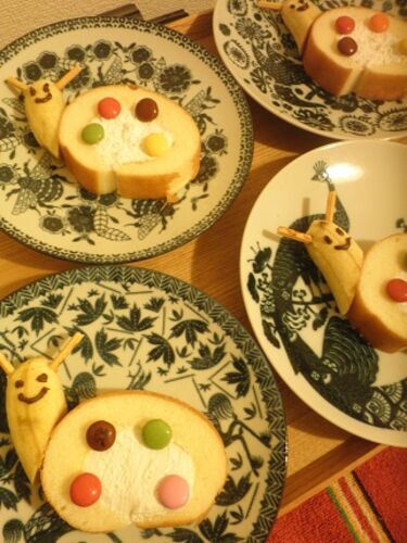 まだ続きます、長女の誕生日メニュー。 微妙に不気味ですが、リクエストのかたつむりケーキ4人分! 買ったばかりの鳥獣五画皿ですが、私のケーキなんて蜂の柄にのってます。 レシピにするほどでもないのですが、全部市販のものでは悲しすぎるのでロールケー…